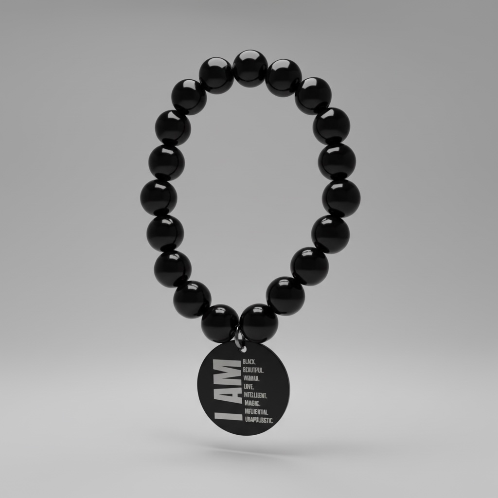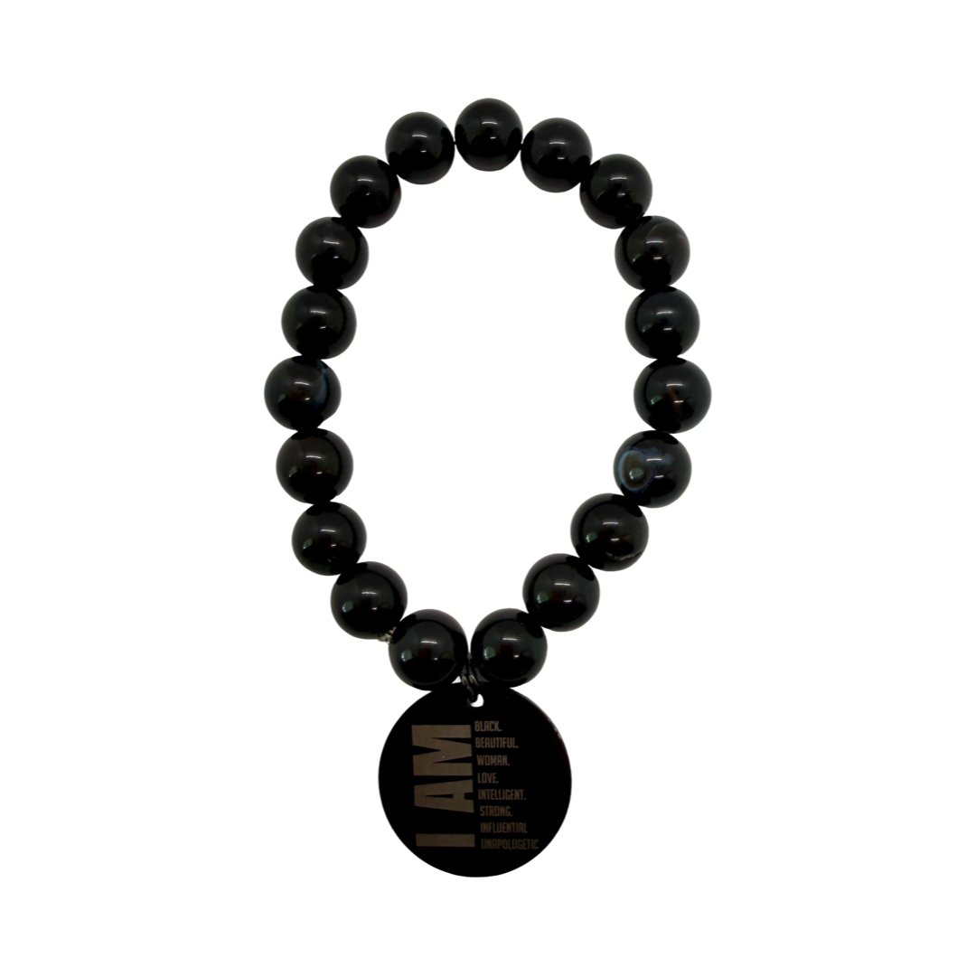 10mm black beads with gold 'I Am' charm. Threaded on an elastic band.