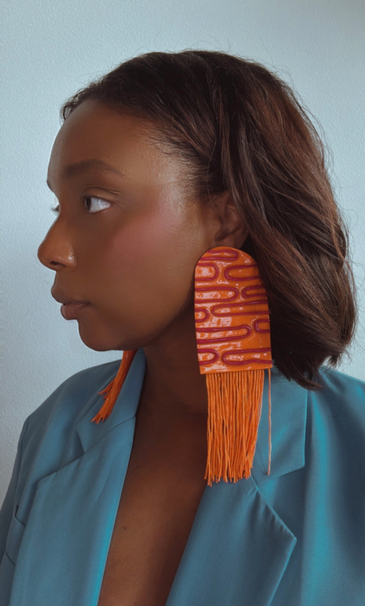 a sunset retro mix, rouched design polymer clay earring with orange fringes and post. approximately 6 inches in length.