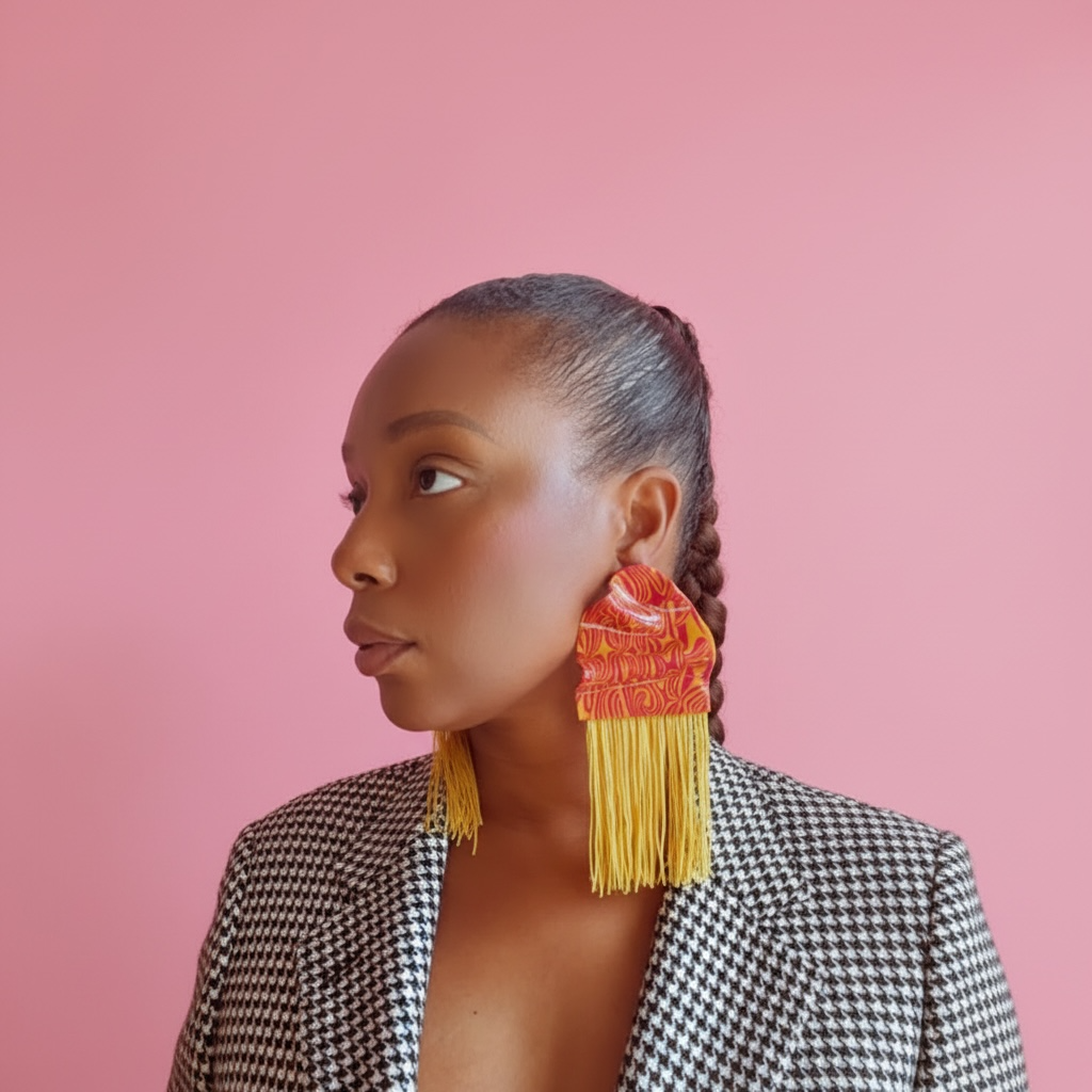 an retro mix, pink and yellow rouched resin coated design polymer clay earring with mustard fringes and post. approximately 6 inches in length.