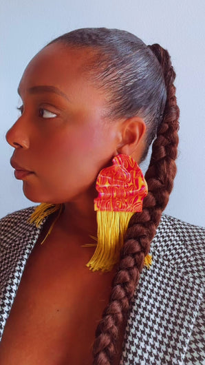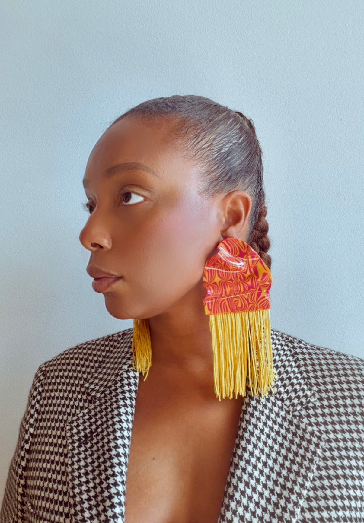 an retro mix, pink and yellow rouched resin coated design polymer clay earring with mustard fringes and post. approximately 6 inches in length.