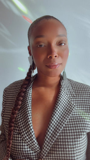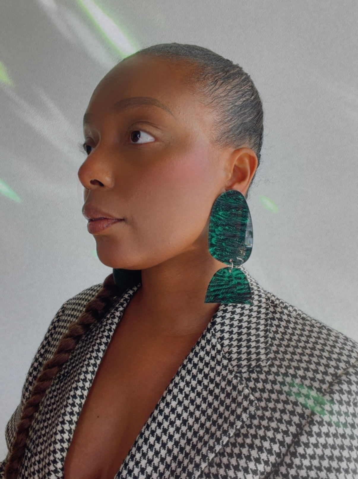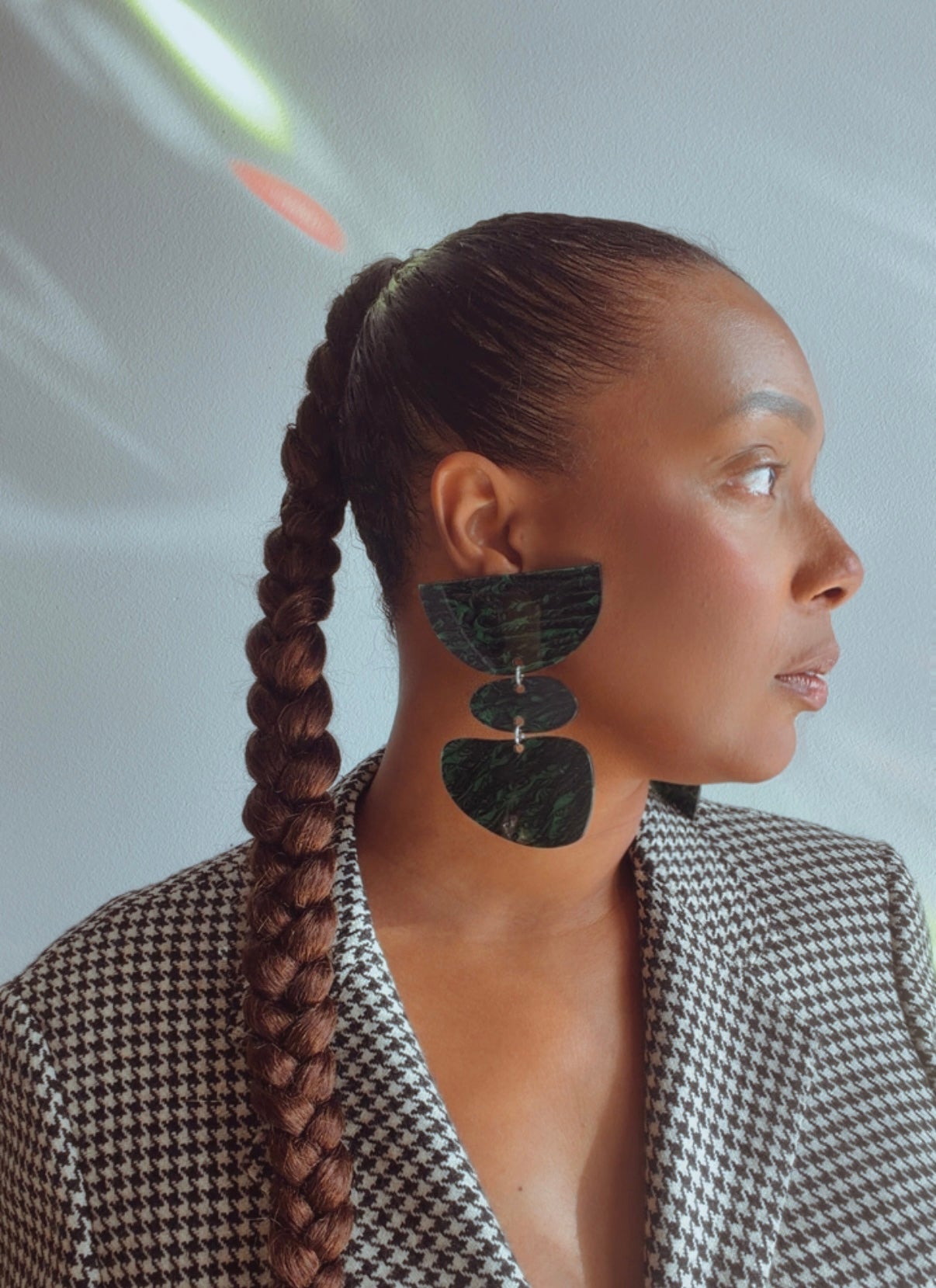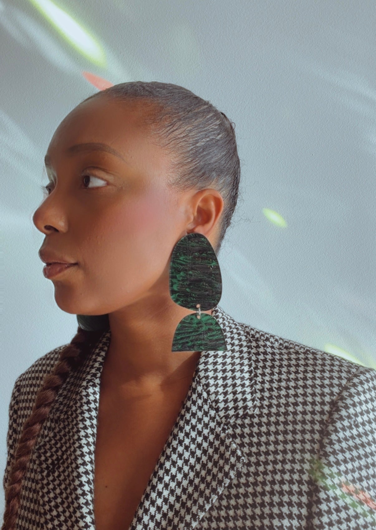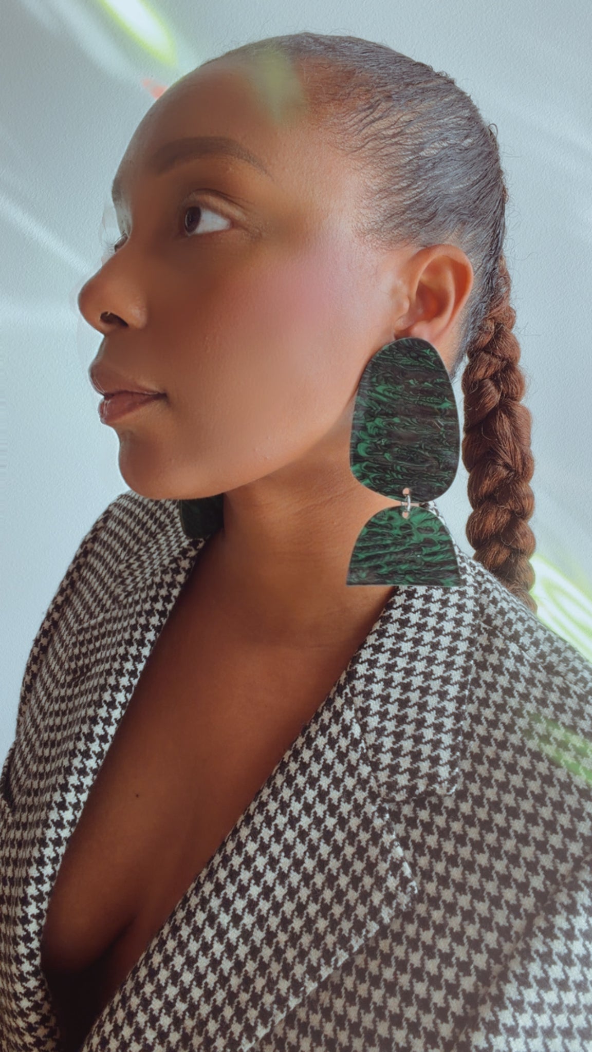 an asymmetrical pair with green and black marble print. 100% acrylic. approximately 4 inches in length. light weight.