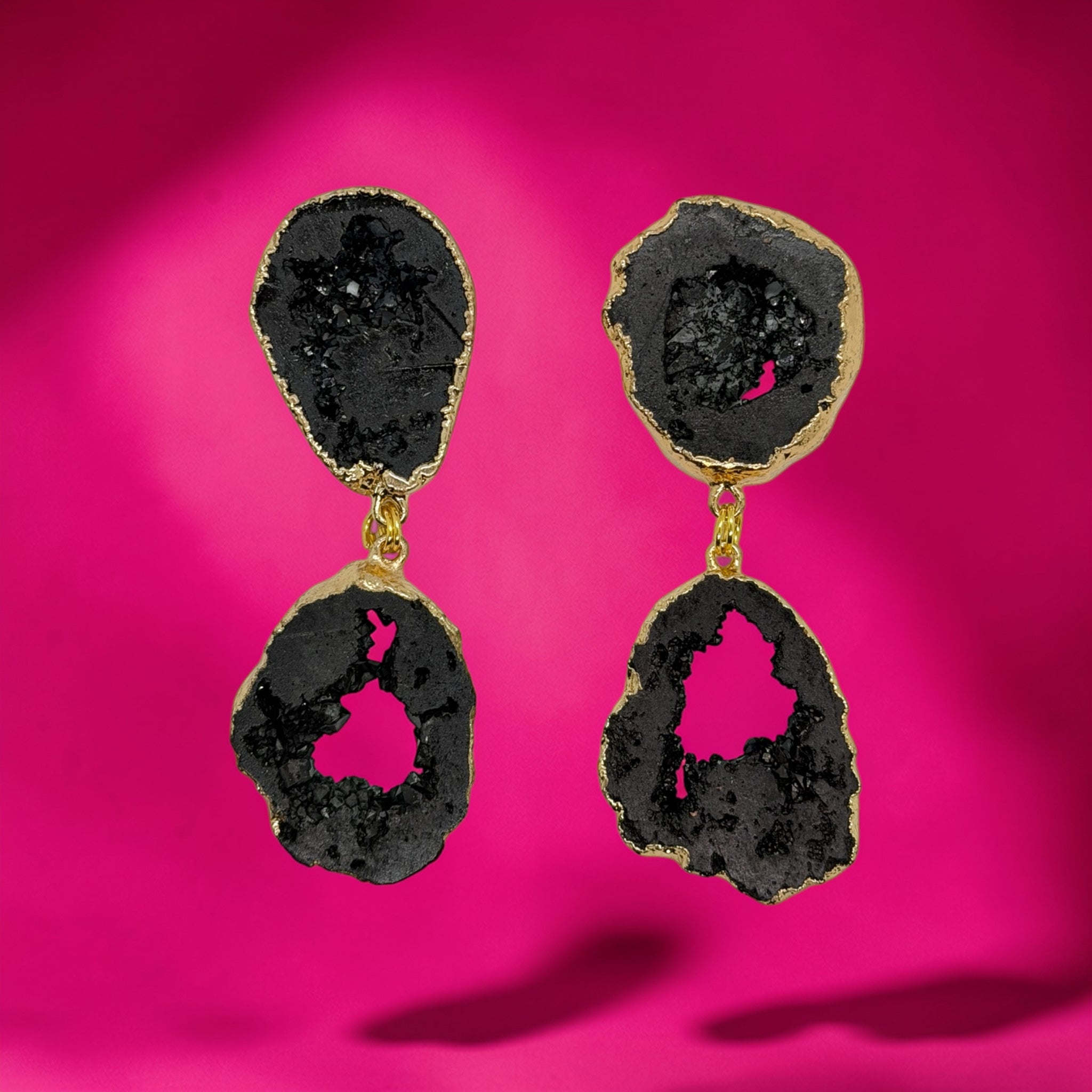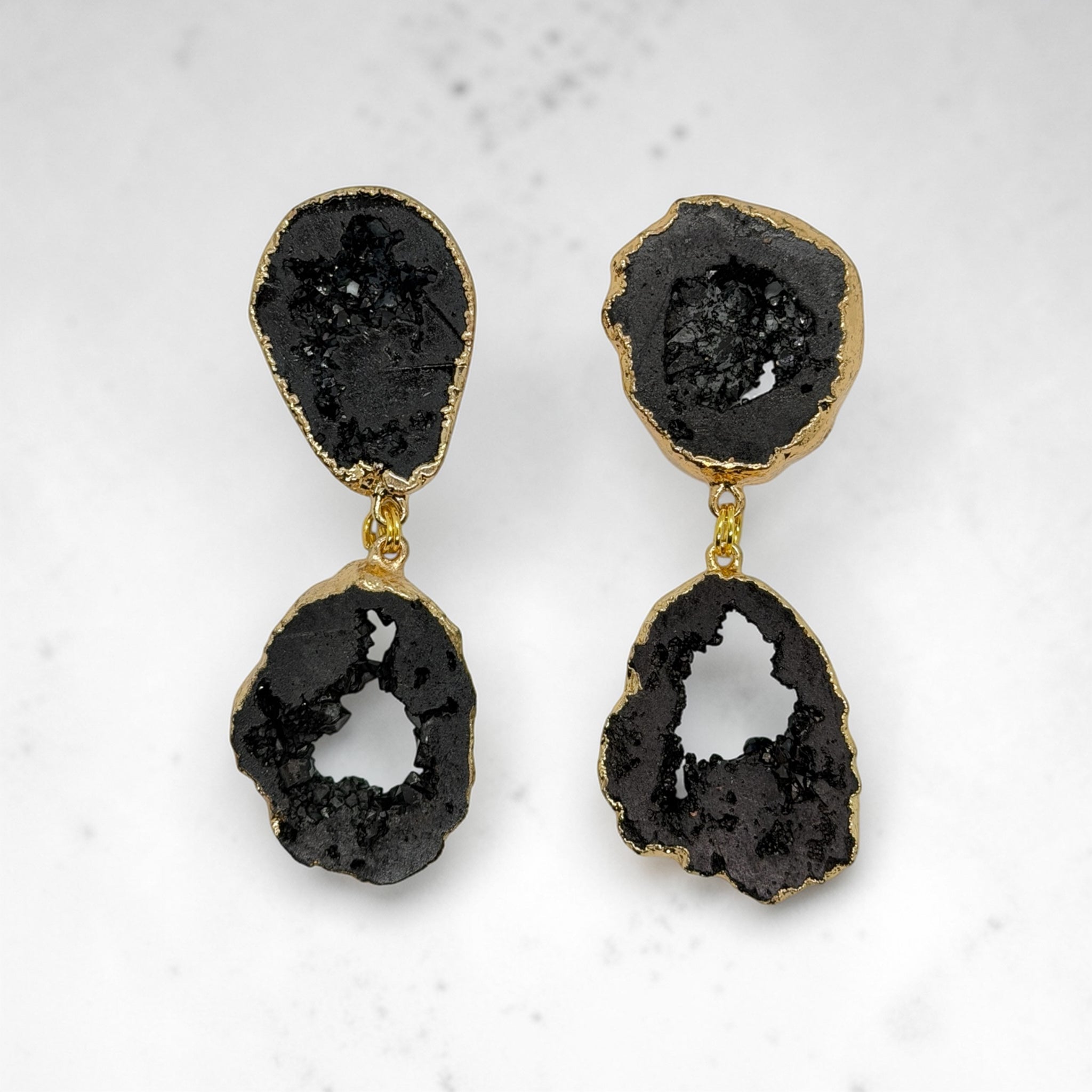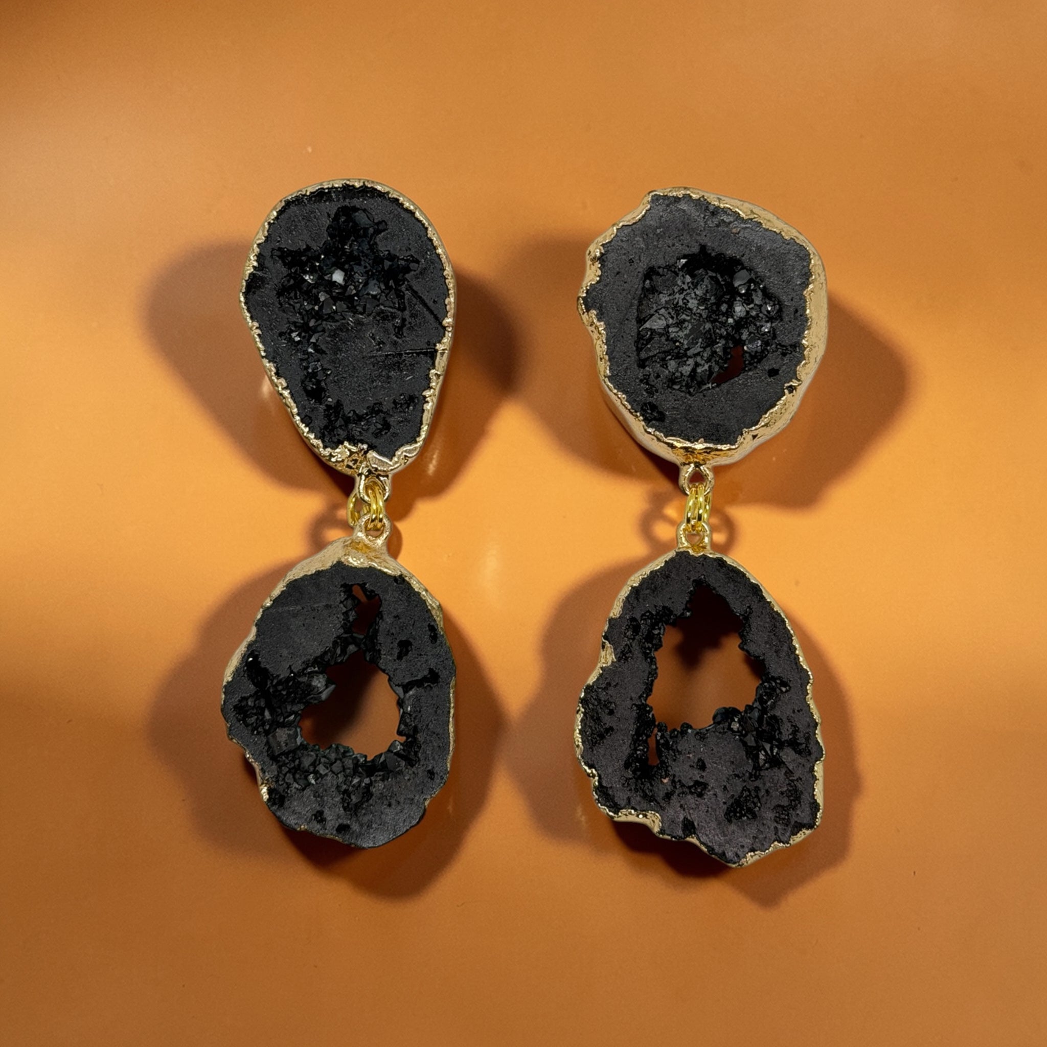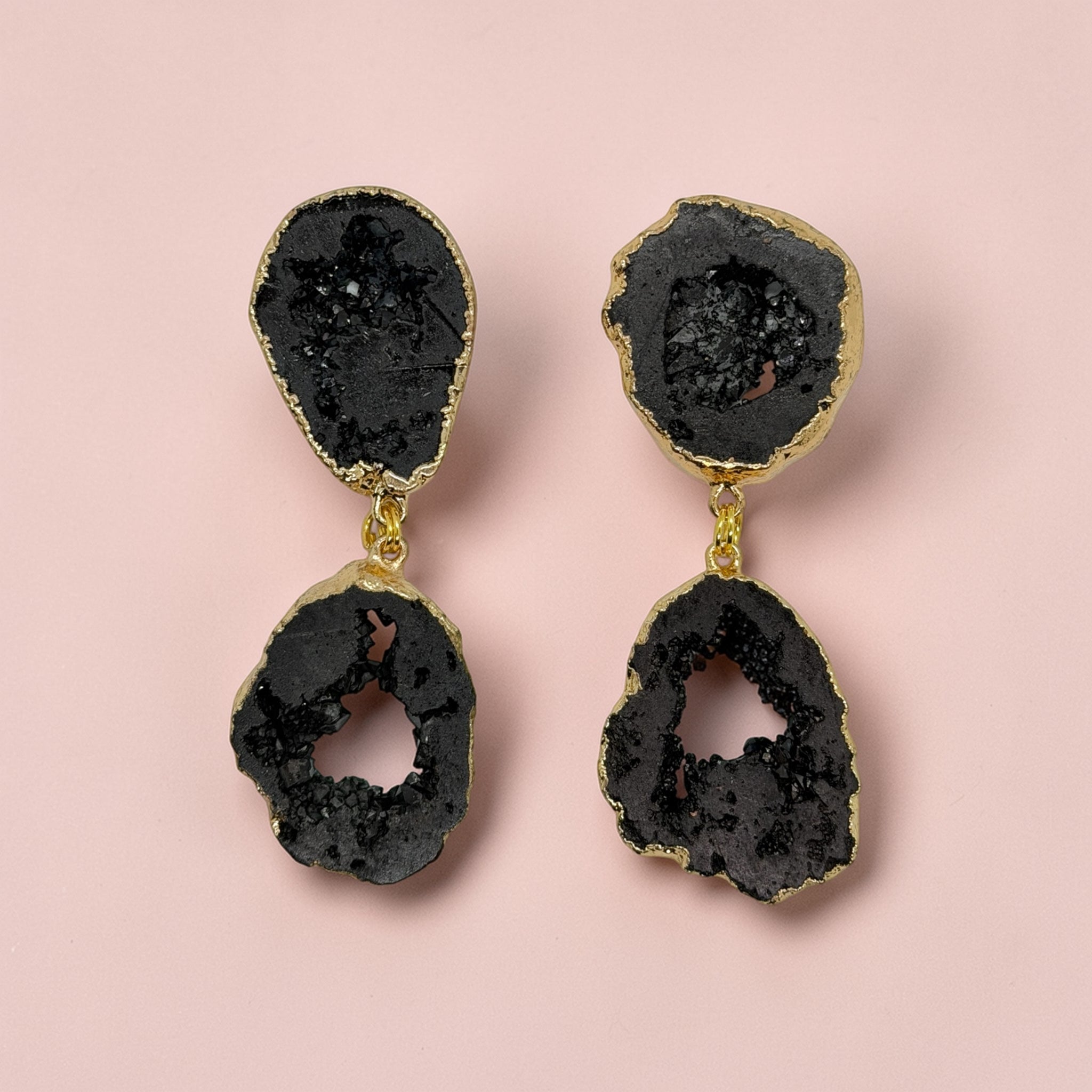 a double stacked black druzy stone. with post back.